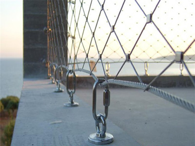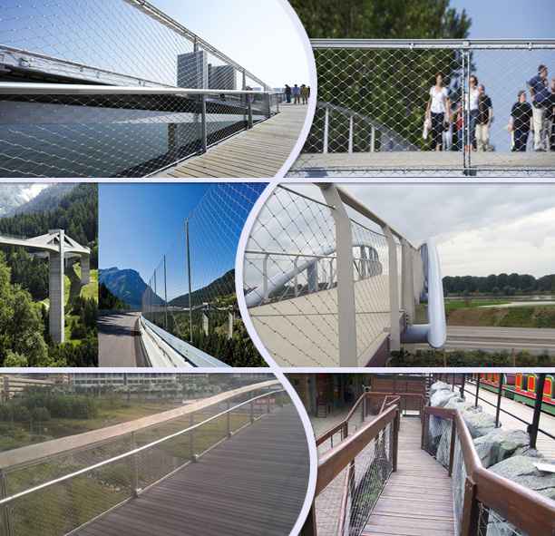 不銹鋼繩網(wǎng)(橋梁用網(wǎng))(橋梁鋼絲繩網(wǎng))(橋梁防護(hù)網(wǎng))(橋梁護(hù)欄)是由不銹鋼繩上下絞織與鋼套擠壓而成,鋼絲繩直徑有1.2、1.5、2.0、3.0、3.2mm,鋼絲繩結(jié)構(gòu)有7*7、7*19、1*19等,材質(zhì)有304、316、316L,其次我們還可以提供熱鍍鋅鋼絲繩網(wǎng)產(chǎn)品。鋼套材質(zhì)主要采用不銹鋼套,其它還有鋁套、銅套、銅鍍錫套以供客戶選擇。產(chǎn)品應(yīng)用于橋梁防護(hù)、安全、吊橋防護(hù)等。